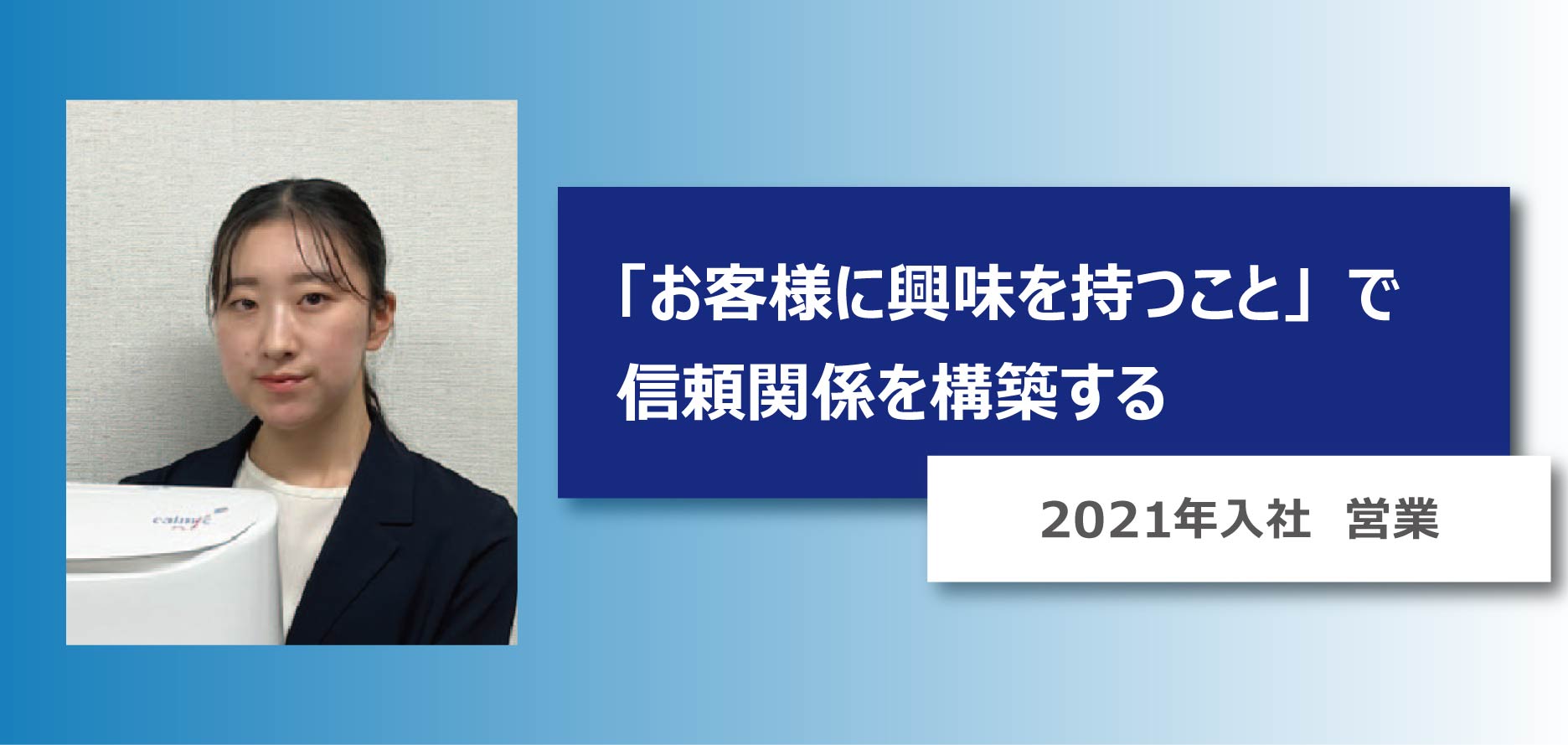 コロナ禍での就職活動だったので、社会的に衛生意識も高まっていた時期でした。カルミックの製品は施設を使う人だけでなく、その方の周りにいる人々にも安心と快適を提供できると考えて入社しました。