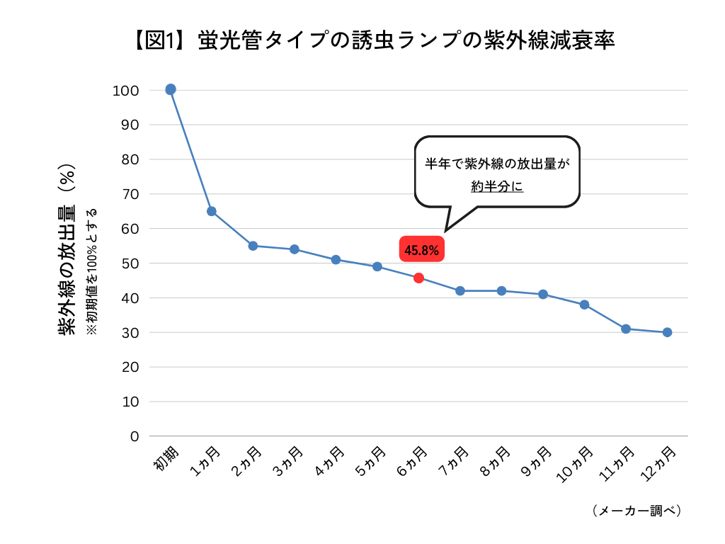 これまで主流であった蛍光管の誘虫ランプは、害虫を誘引できる紫外線の放出量が半年で半減してしまうため(※1)、約半年に1度の交換が必要でした。