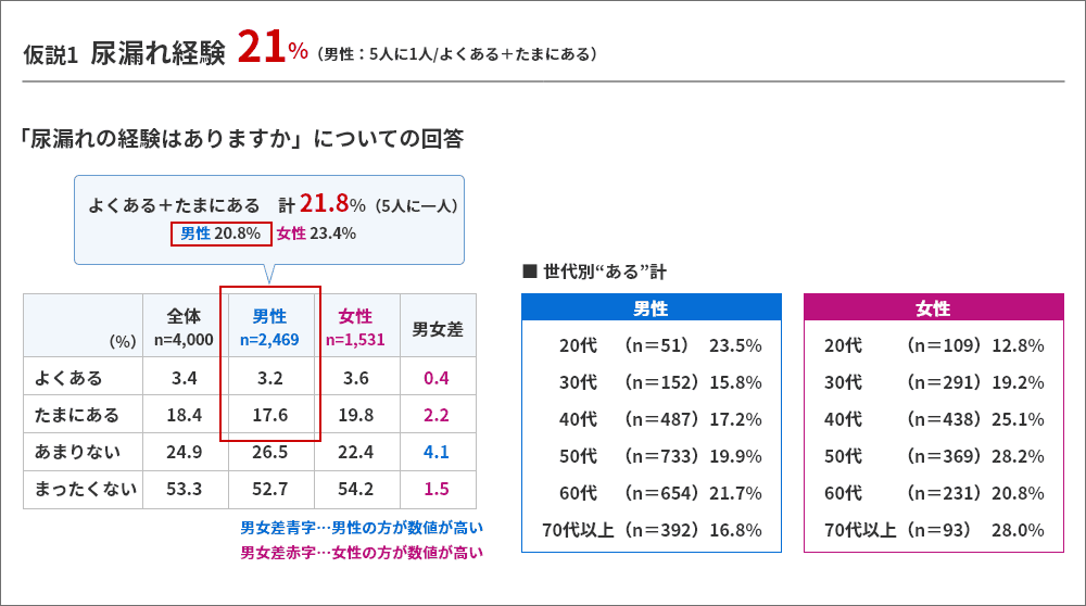 「尿漏れの経験がありますか」という質問に男性の27.5%、約4人に1人の方が「ある」と回答しています。