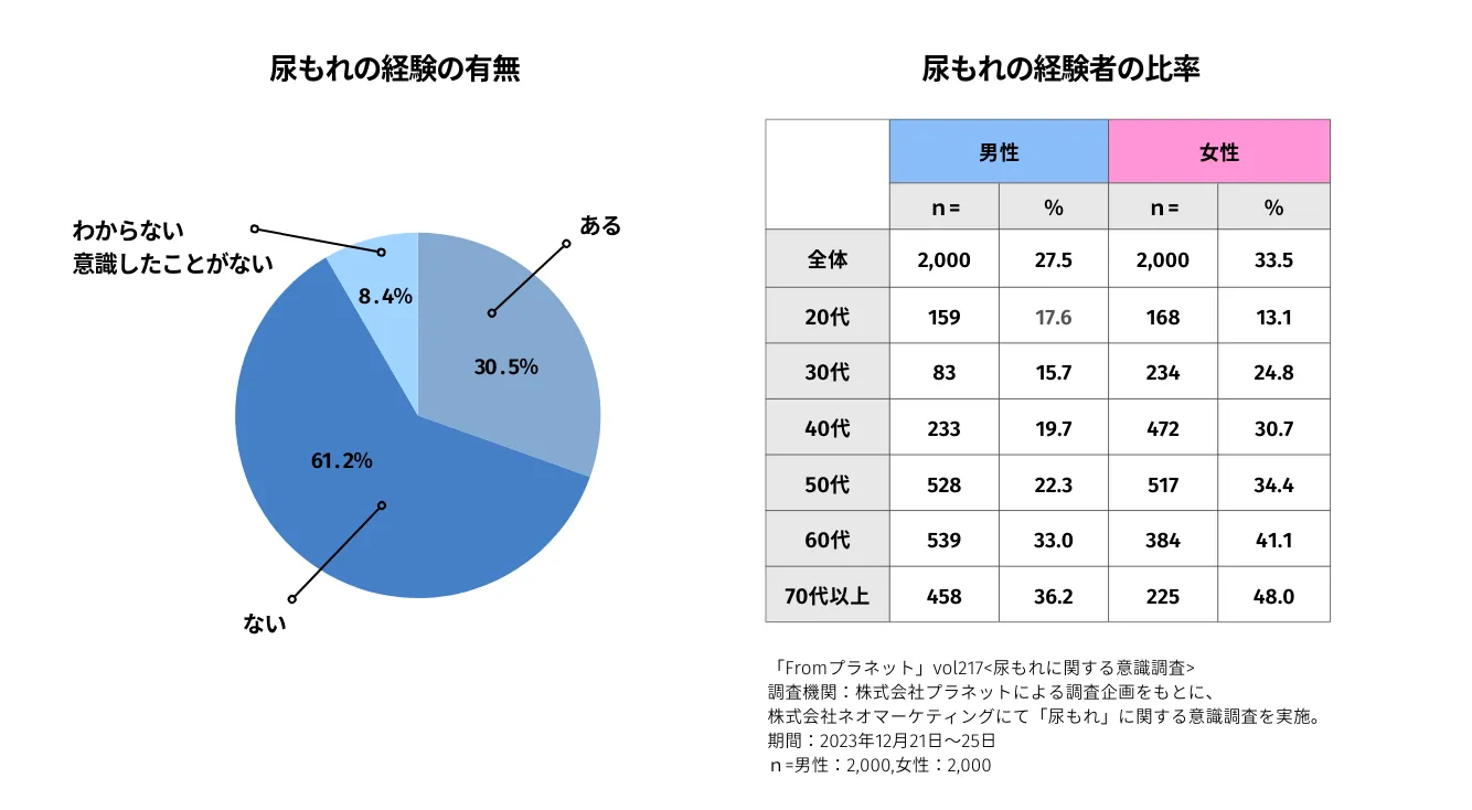 以下のデータは、「尿漏れ経験」についてのアンケート結果です。