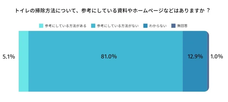 しかし子どもたちだけの清掃では、専門的な清掃知識や清掃技術を持ち合わせていないため十分なトイレ掃除を行えず、その結果、学校のトイレが汚れたままとなってしまいます。 事実、「トイレの掃除⽅法について、参考にしている資料やホームページなどはありますか?」という質問に対して、「ない」(81.0%)や 「わからない」(12.9%)と答えていることからも、回答した学校の9割以上で適切なトイレ掃除の指導が不足している現状がうかがえます。