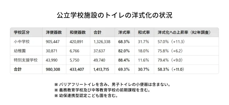現在、家庭や公共施設などでは洋式トイレが一般的に多く採用されています。洋式トイレの形状は、和式トイレで起こりがちな排泄物の周囲への飛び散りやニオイの広がりを抑えることができるため衛生面で優れています。しかし学校には、依然として和式トイレが多く残っているようです。文部科学省の2023年調査によると、小・中学校など全国の公立学校施設における和式トイレの割合は、実に31.7%を占めています。