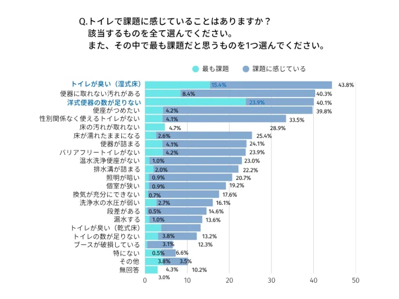アンケートによると、最も課題に感じていることは「洋式便器の数が⾜りない」(23.9%)で、「トイレが臭い(湿式床)」(15.4%)よりも多いという結果になっています。