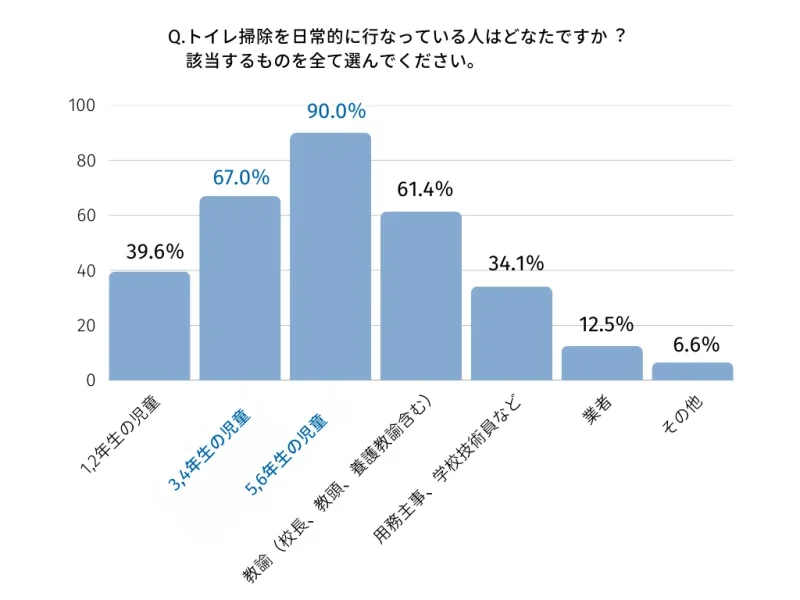 2つ目のヒントは、適切なトイレ掃除の知識を持つことです。同じく、日本トイレ研究所などの調査(2023年)では「トイレ掃除を⽇常的に⾏っている⼈はどなたですか?」という質問に対し、「5,6 年生の児童」(90.0%)、「3,4年生の児童」(67.0%)の順で高い割合を示しており、小学校では主に高学年の児童がトイレ掃除を担っていることがわかります。